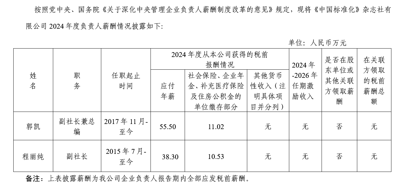 《中國標準化》雜志社有限公司企業負責人2024年度薪酬情況
